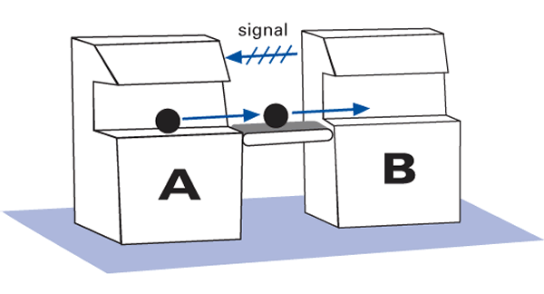 In the Illustration, neither of the machines nor the conveyor will cycle unless three conditions are met: Machine A is full, the conveyor contains the standard amount of work-in-process (in this case, one piece), and Machine B is empty. When those conditions are met, all three will cycle once and wait until the conditions are met again.