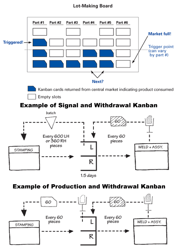 A lot-making board involves creating a physical kanban for every container of parts in the system (see illustration below). As material is consumed from the market, the kanban are periodically detached and brought back to the producing process and displayed on a board that highlights all part numbers and displays an outlined shadow space for each of the kanban cards in the system. (Adapted from Smalley 2004, pp. 70–71.)