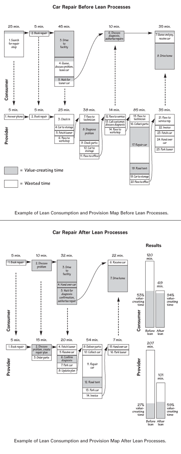To complete the mapping exercise, the two maps are displayed in parallel—one above the other—to show a complete consumption/provision cycle. The combined map helps providers “see” the whole process so they can identify and eliminate wasteful activities in consumption and provision and begin a win-win collaboration by drawing a leaner future-state map. (Womack and Jones 2005, pp. 22–45.)