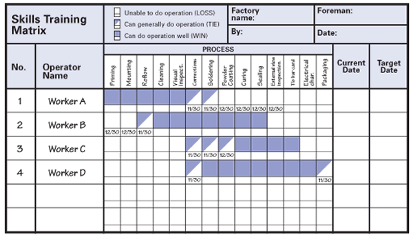 In the sample plan below, the needed skills are arrayed across the top with employees listed in the left column. The shading is in proportion to the level of skills attained. The dates in empty or partially shaded boxes are targets for attaining the needed skills. This tool is particularly useful for assessing progress in training employees in the multiple skills needed for multiprocess handling.