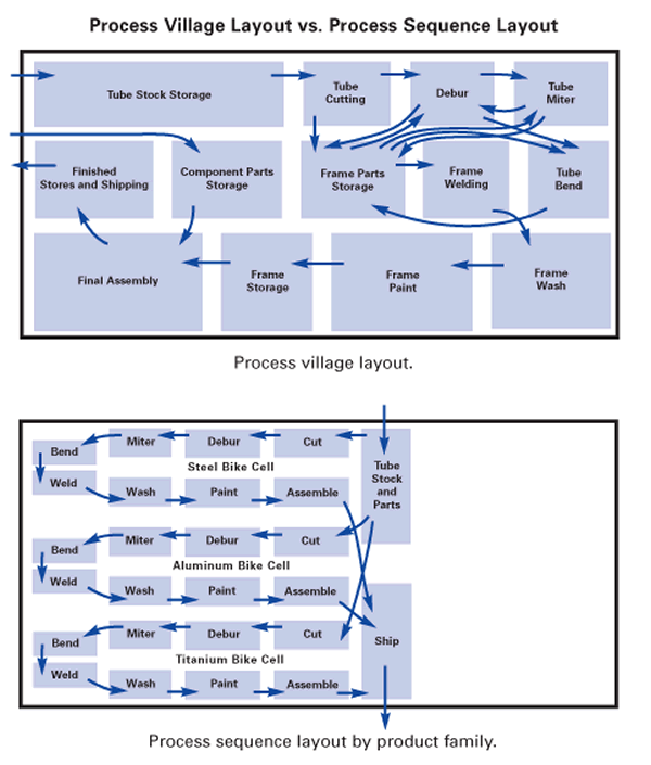 The illustration shows two plant layouts contrasting process village and process sequence material flow in a bicycle plant.