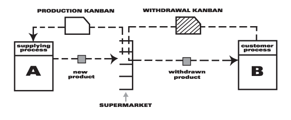 Supermarkets ordinarily are located near the supplying process to help that process see customer usage and requirements. Each item in a supermarket has a specific location from which a material handler withdraws products in the precise amounts needed by a downstream process. As an item is removed, a signal to make more (such as a kanban card or an empty bin) is taken by the material handler to the supplying process.