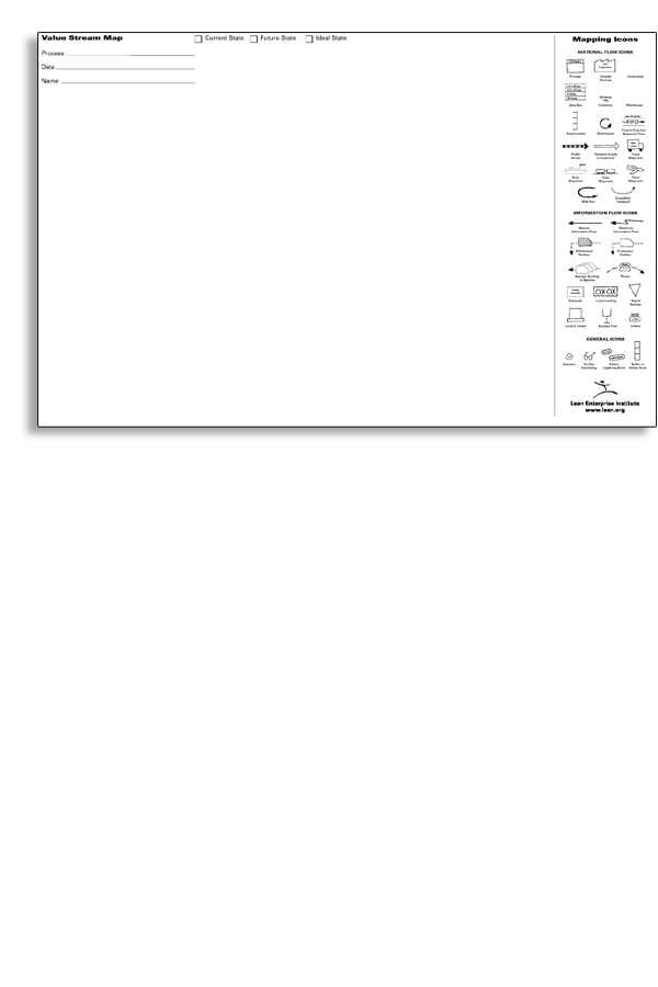 Generous-sized value stream mapping pads. Each sheet is 11 x 17 inches so you have plenty of room to draw no matter how much your current state resembles “spaghetti world.” And the mapping icons are conveniently reproduced in the right-hand margin where you can refer to them at a glance.